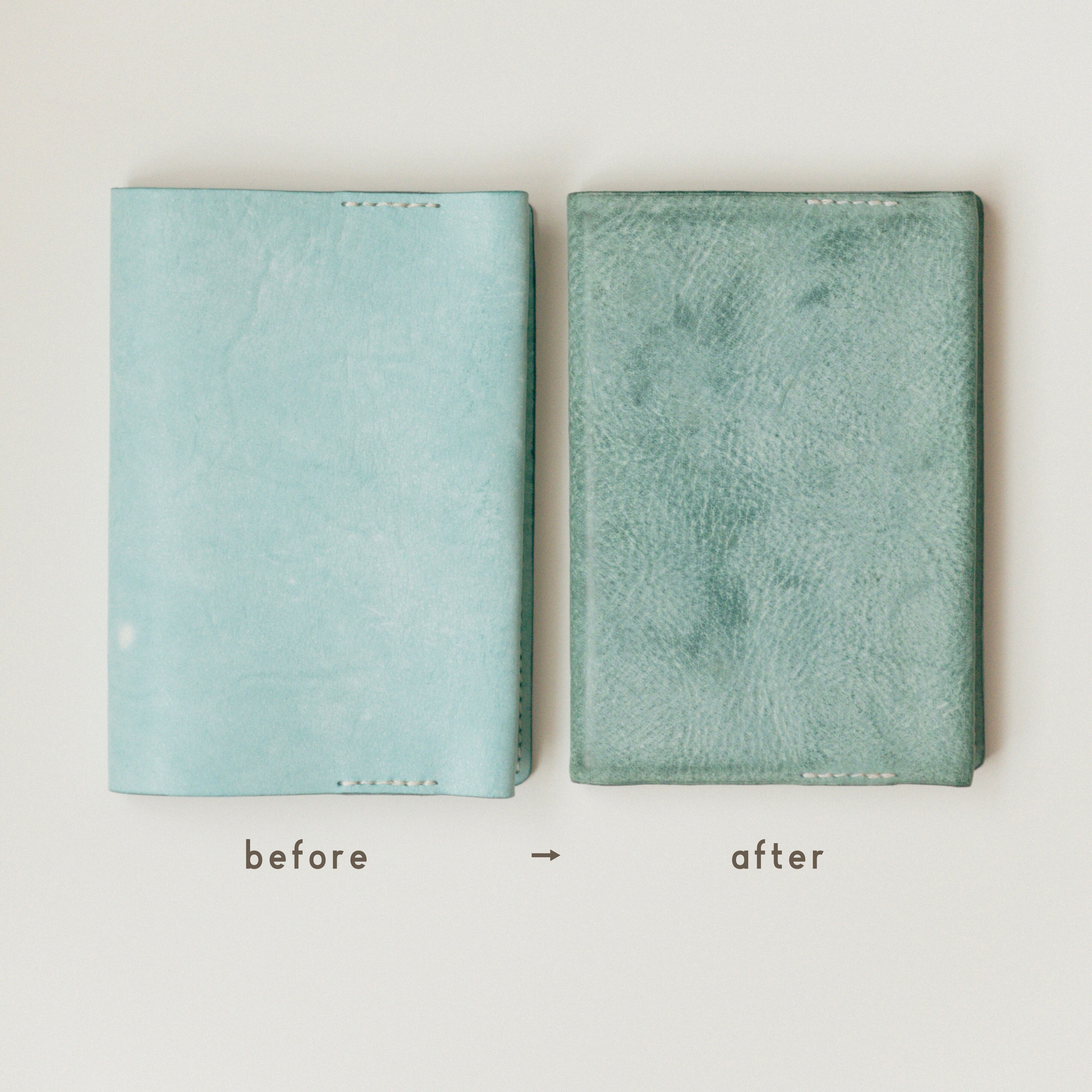 ロウ引き加工により、最初はワックスが表面にあることで白みがかっていますが、使い込むほどに摩擦によってロウが革の中に浸透して行き、艶と共に革本来色が現れてきます。経年変化後のイメージは革の裏面の色を参考にしていただくといいと思います。