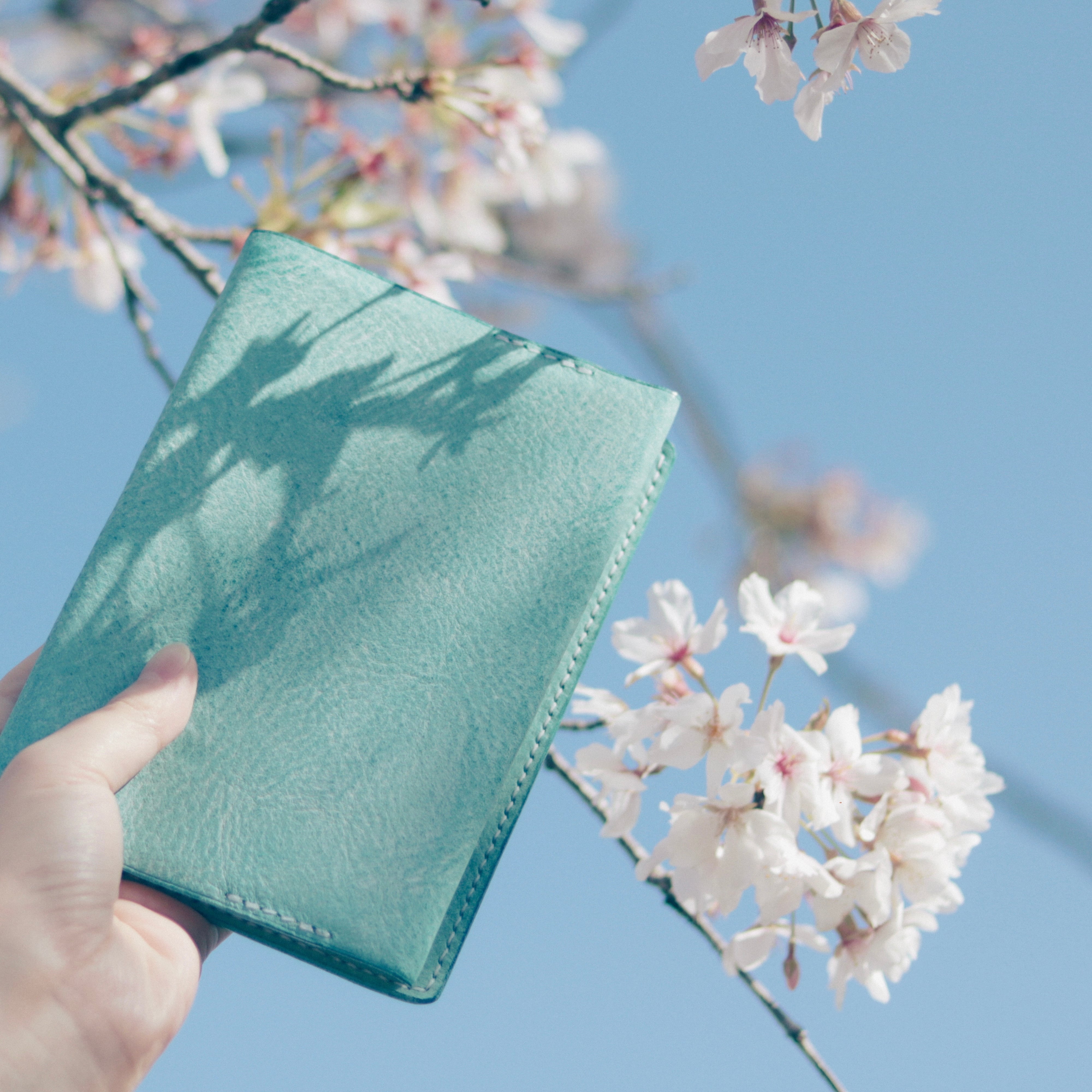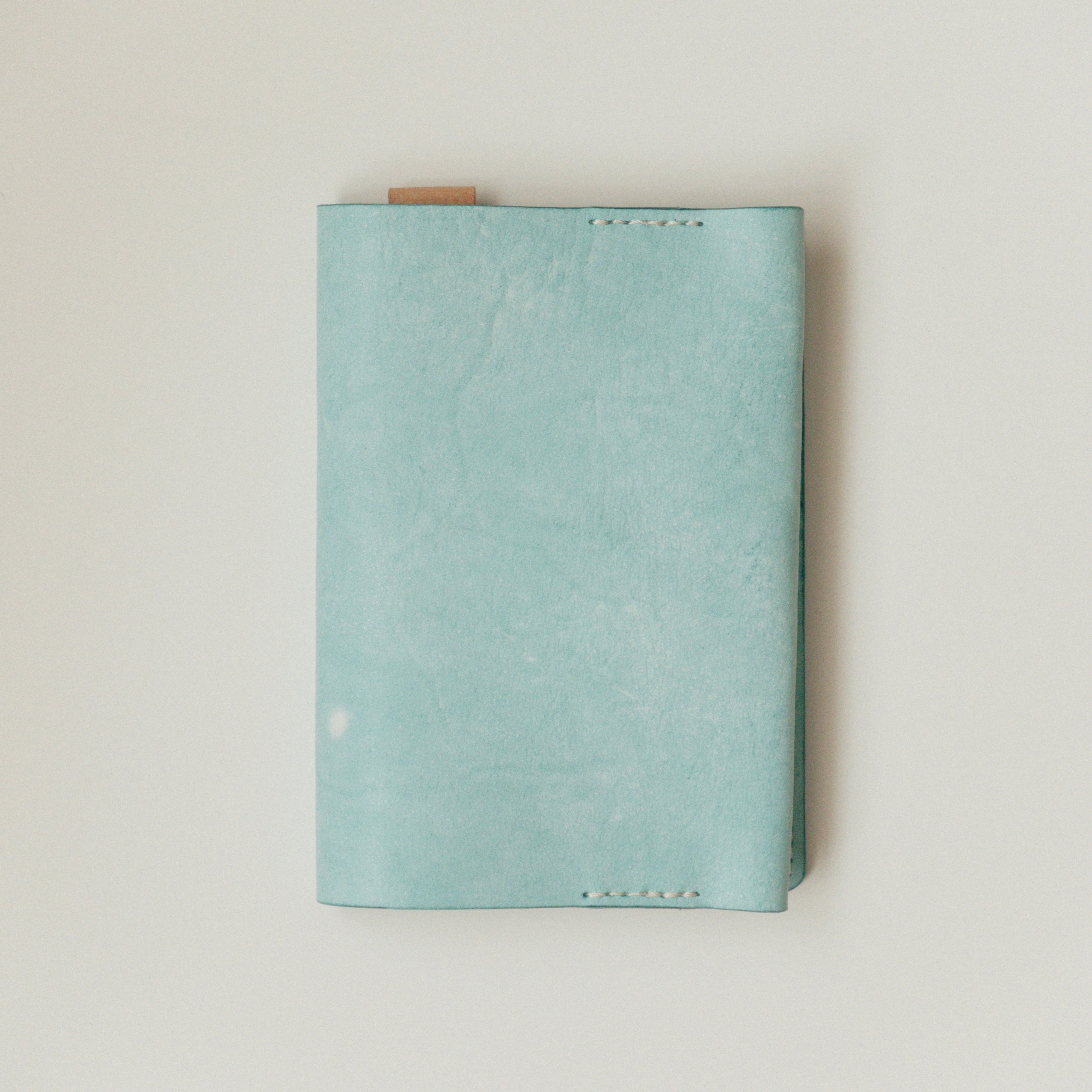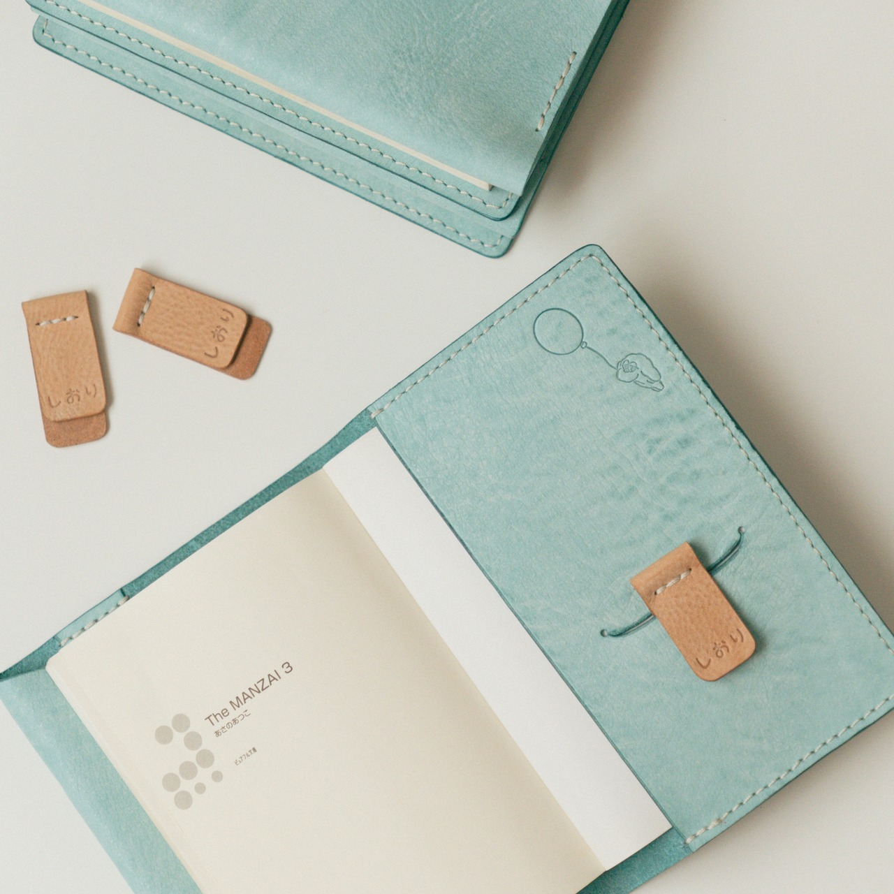 淡い水色の革を、あおぞらに見立てたブックカバー。